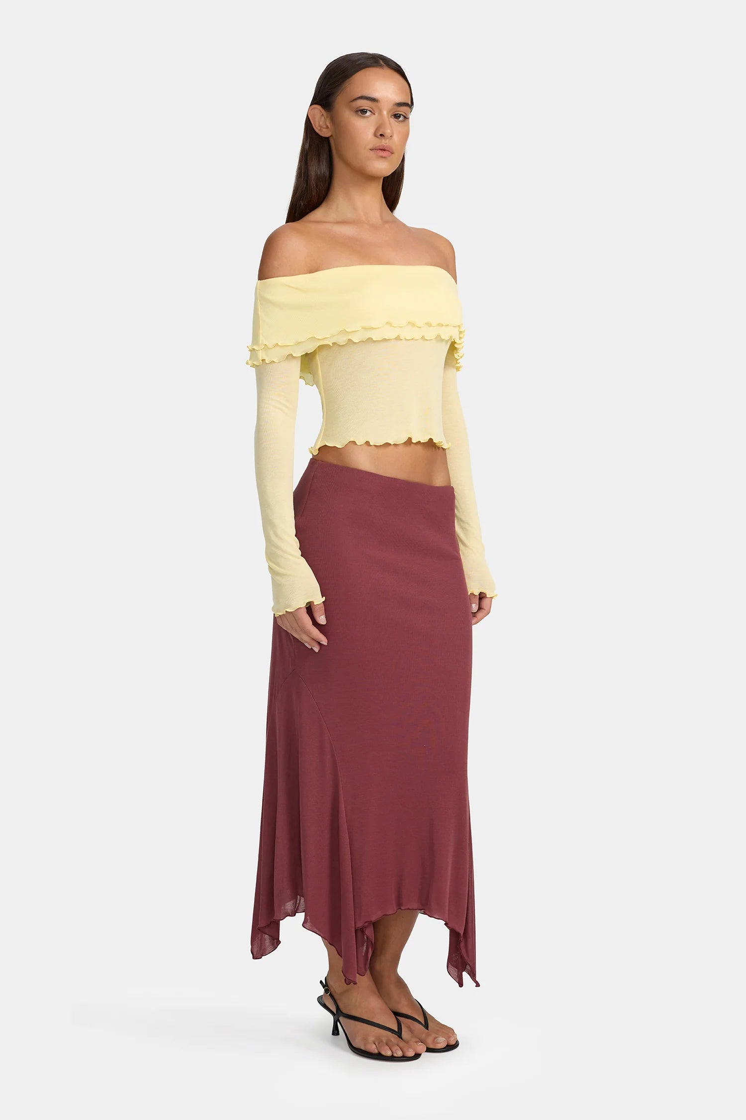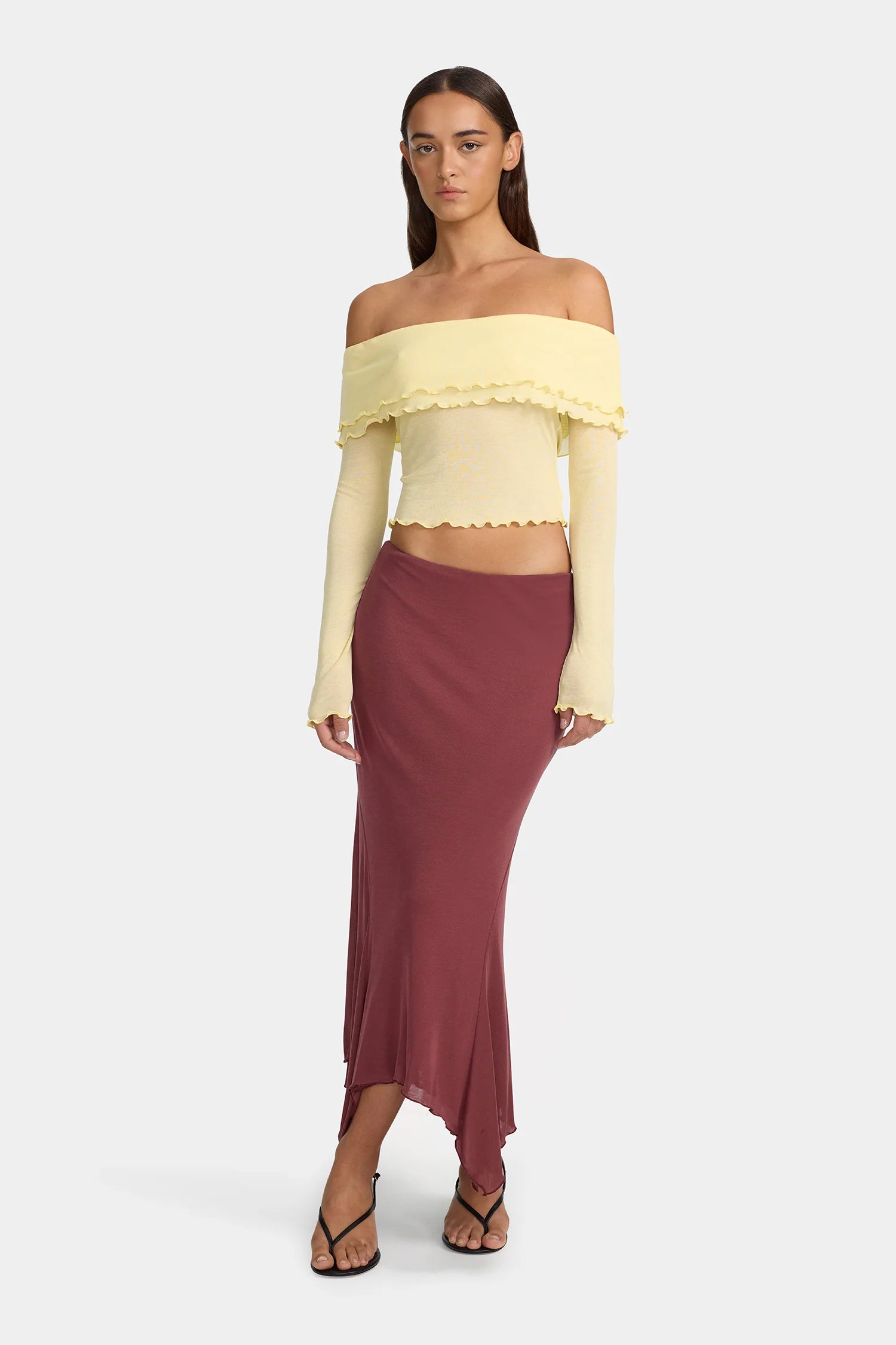 The Bebe top is a long sleeve off the shoulder top made from a super soft jersey fabrication. The top is fitted and features a grip tape edge for extra support. The top is semi-sheer, but offers lining on the bust.