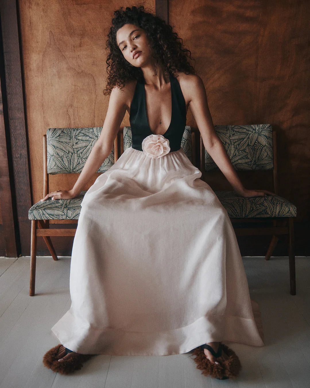 The Calla Maxi Dress is a backless maxi designed with a halter bodice and a soft gathered skirt. The dress is accented with a delicate handmade flower at the centre front of the bodice. The top features princess seams for a tailored fit and an adjustable hook-and-eye closure at the back neck. A gorgeous piece to dress up for your next special event.