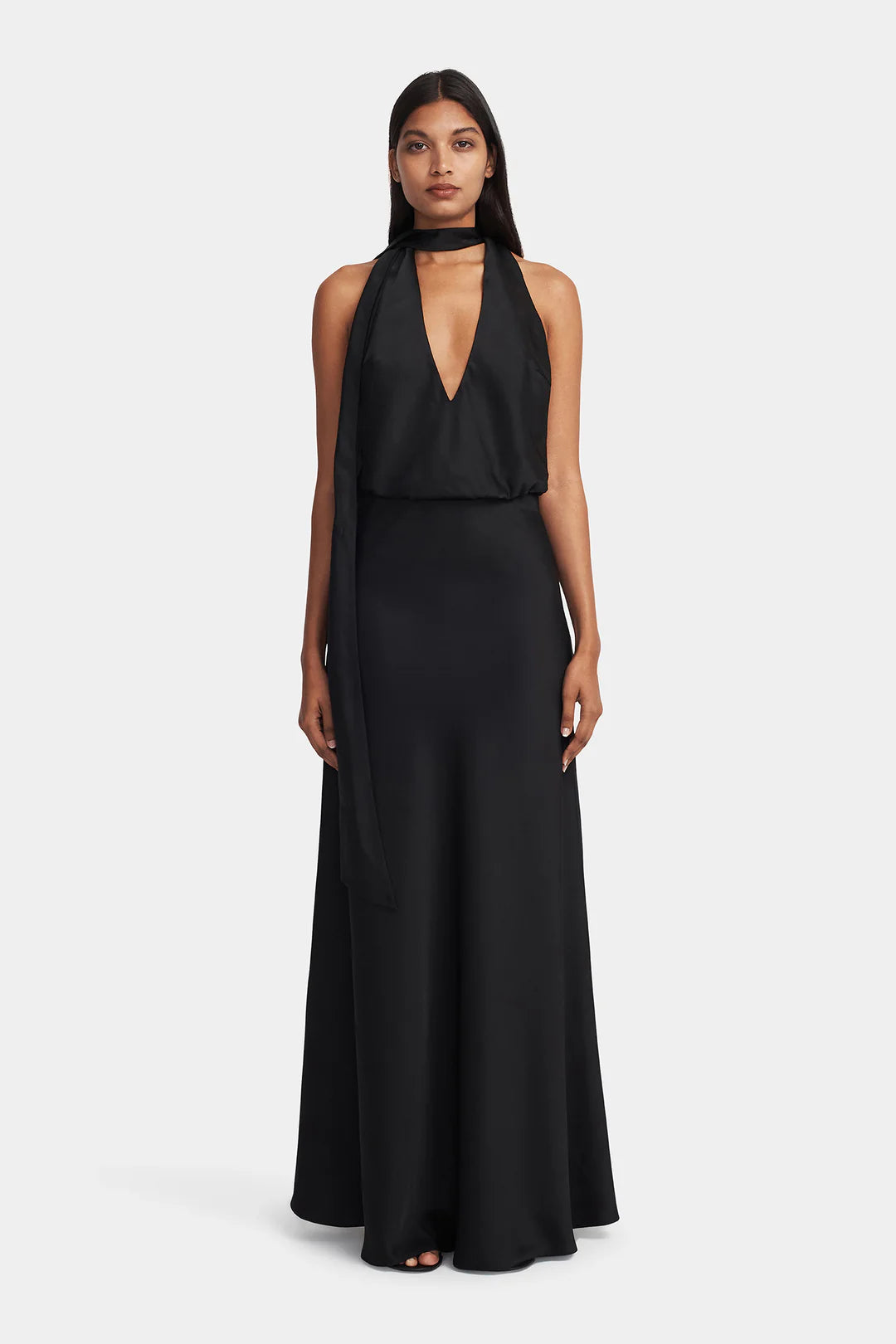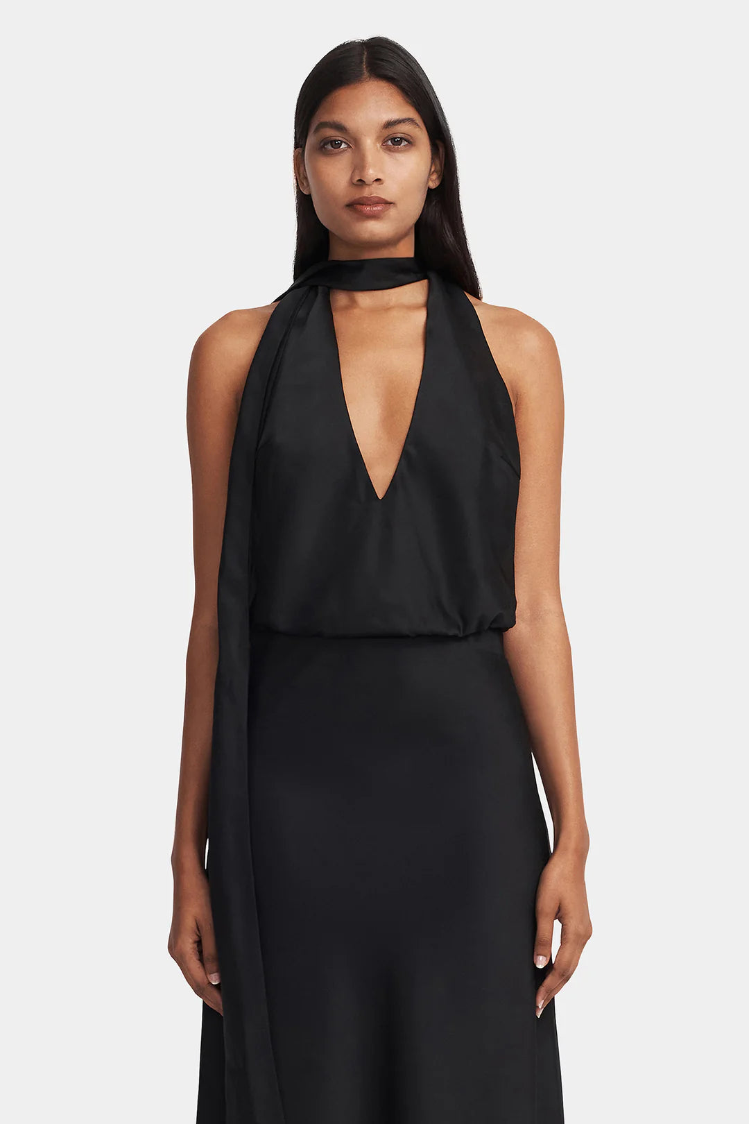 The Harper Halter Top is a gorgeous open back top with a deep V plunging neckline. The top has a long neck tie that can be styled in multiple ways as desired