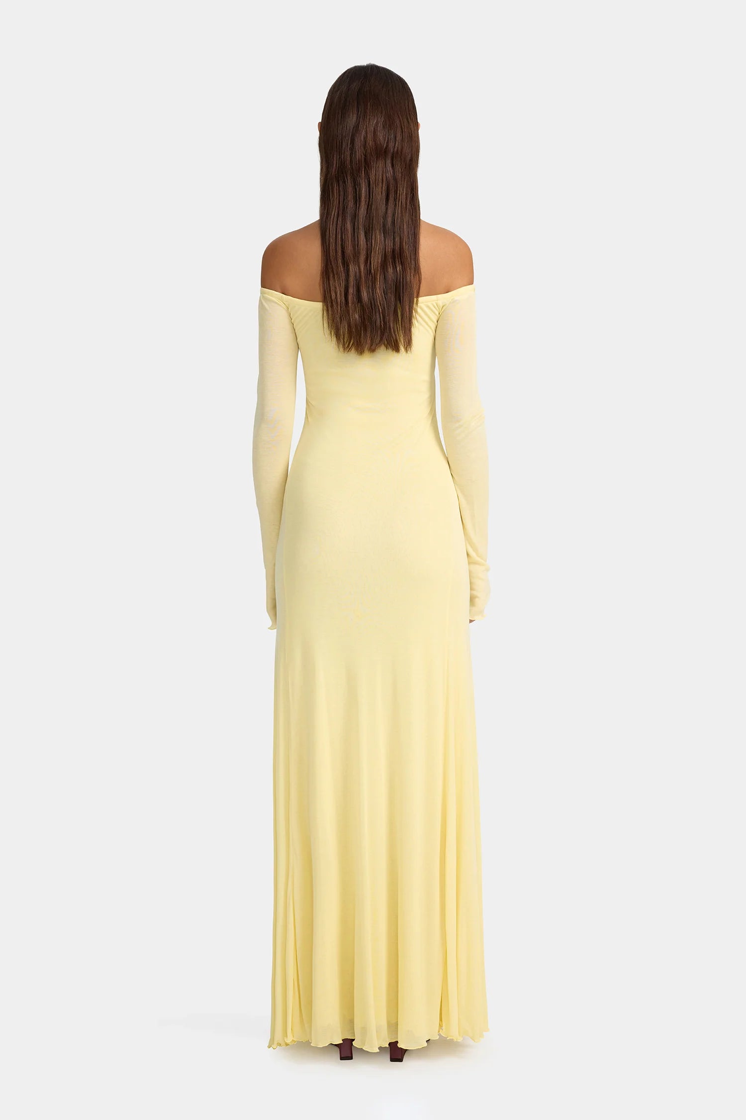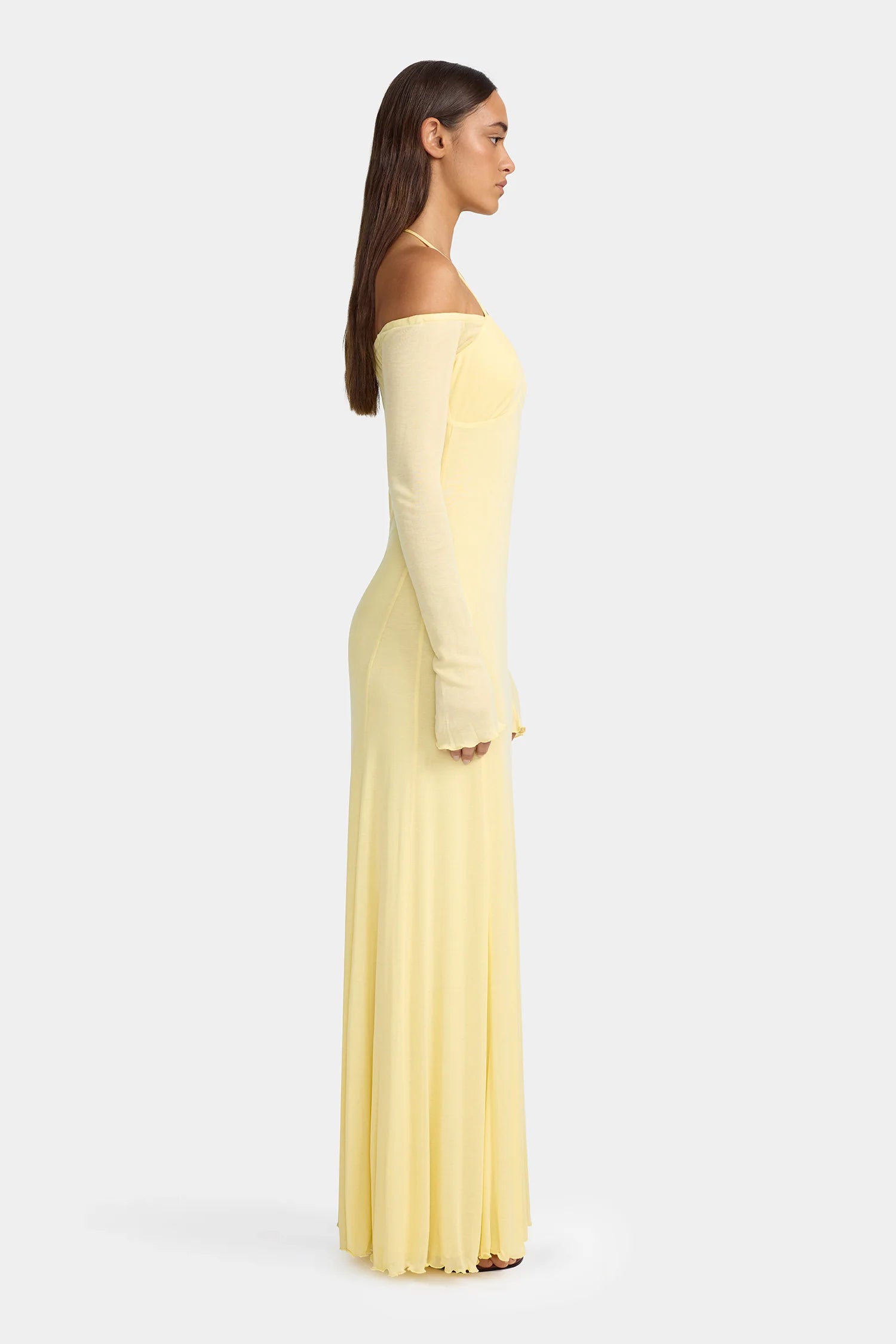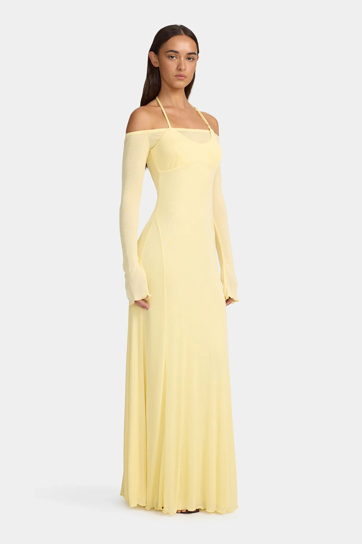 The Karina Dress is a fitted long sleeve maxi dress featuring a bralette overlay detailing on the shoulders. The bralette straps are adjustable and the dress is fully lined. Both the bottom and the sleeve cuffs feature a baby lock hemline.