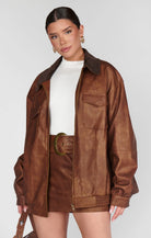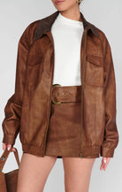The coolest jacket in any room, the Maverick Bomber shines in rich chestnut brown faux leather and features multiple pockets for style and function. A must-have staple for every capsule wardrobe, it pairs perfectly with boots and the matching Maverick Mini Skirt!