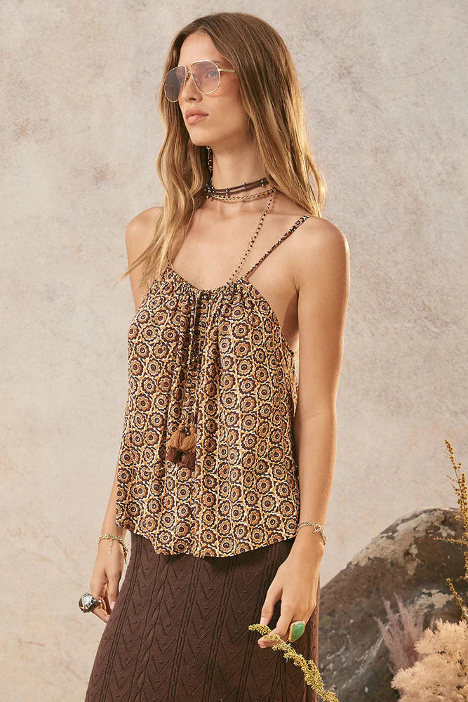 Get ready to turn heads in the Sannah Cami in Golden Ochre. The allover print exudes confidence and a hint of rebellion, while the front ties and elastic back provide a flattering and customizable fit. With adjustable straps, this cami is sure to become your new go-to for any occasion.