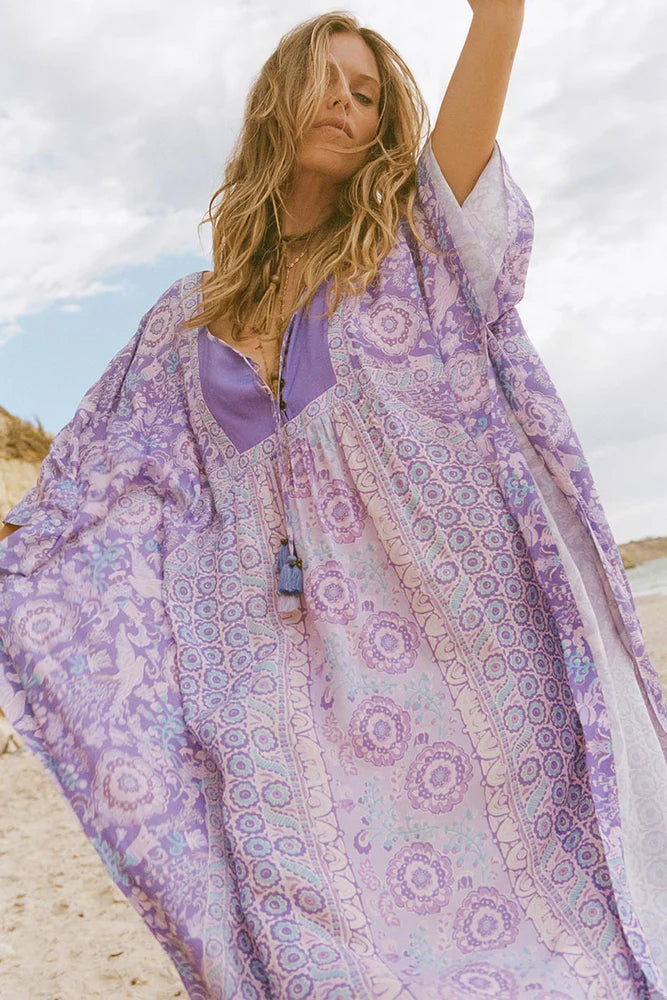 Get ready to turn heads in the Sannah Gown! This stunning maxi dress features a unique allover print, front neck button opening, neck ties, and tassel trim on the tie ends. Made with 100% LENZING™ ECOVERO™ Viscose, it offers both comfort and style. Rock this playful lavender gown and make a statement wherever you go!