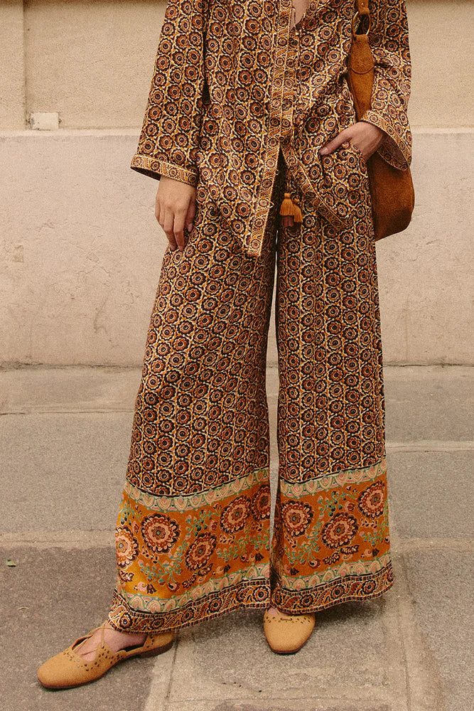 The Sannah Pant in Golden Ochre is a perfect blend of fashion and comfort. Featuring a unique allover print and playful border print on the hem, these pants will make a statement wherever you go. The elastic back waist ensures a perfect fit, while the side front pockets add functionality. Rock these pants with confidence and stand out in the crowd!