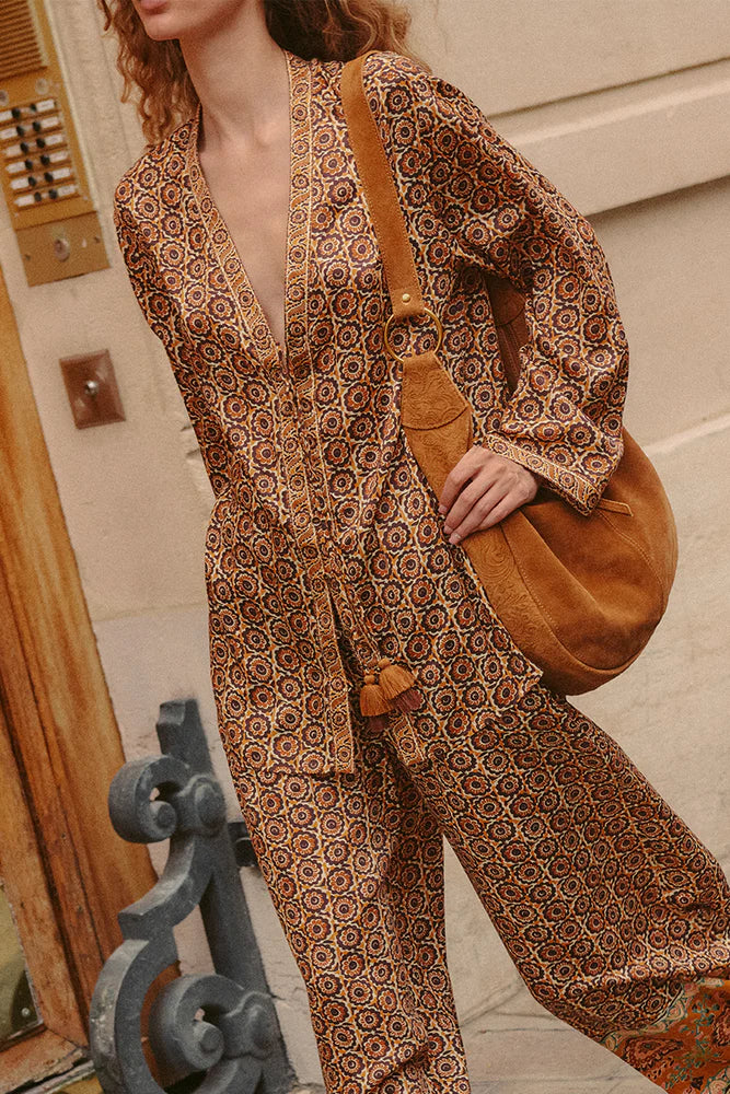 The Sannah Tie Blouse in Golden Ochre is the perfect blend of playful and chic. The allover print and border print on the neck and cuff adds a touch of whimsy, while the front button opening and neck ties add a touch of sophistication. Complete with tassel trim on the tie ends, this blouse is perfect for any occasion.