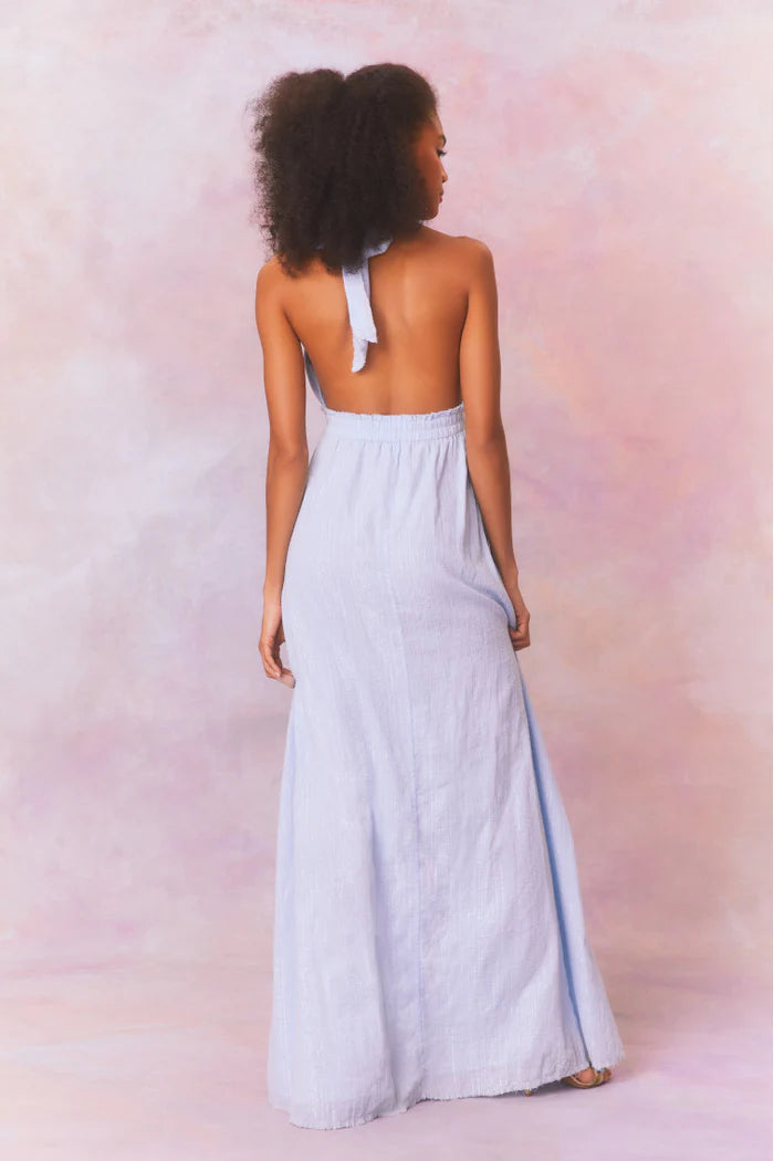 The dress that started it all, meet the Love Dress. Easy to move in, easy to live in, and easy to love in. Our signature dress returns with a textural gauze fabric with a shimmering lurex throughout. The piece has a halter neck that ties in the back and empire waist that transcends into a flowy skirt that glides with ease. This timeless dress is finished with a removable flower pin at center front.