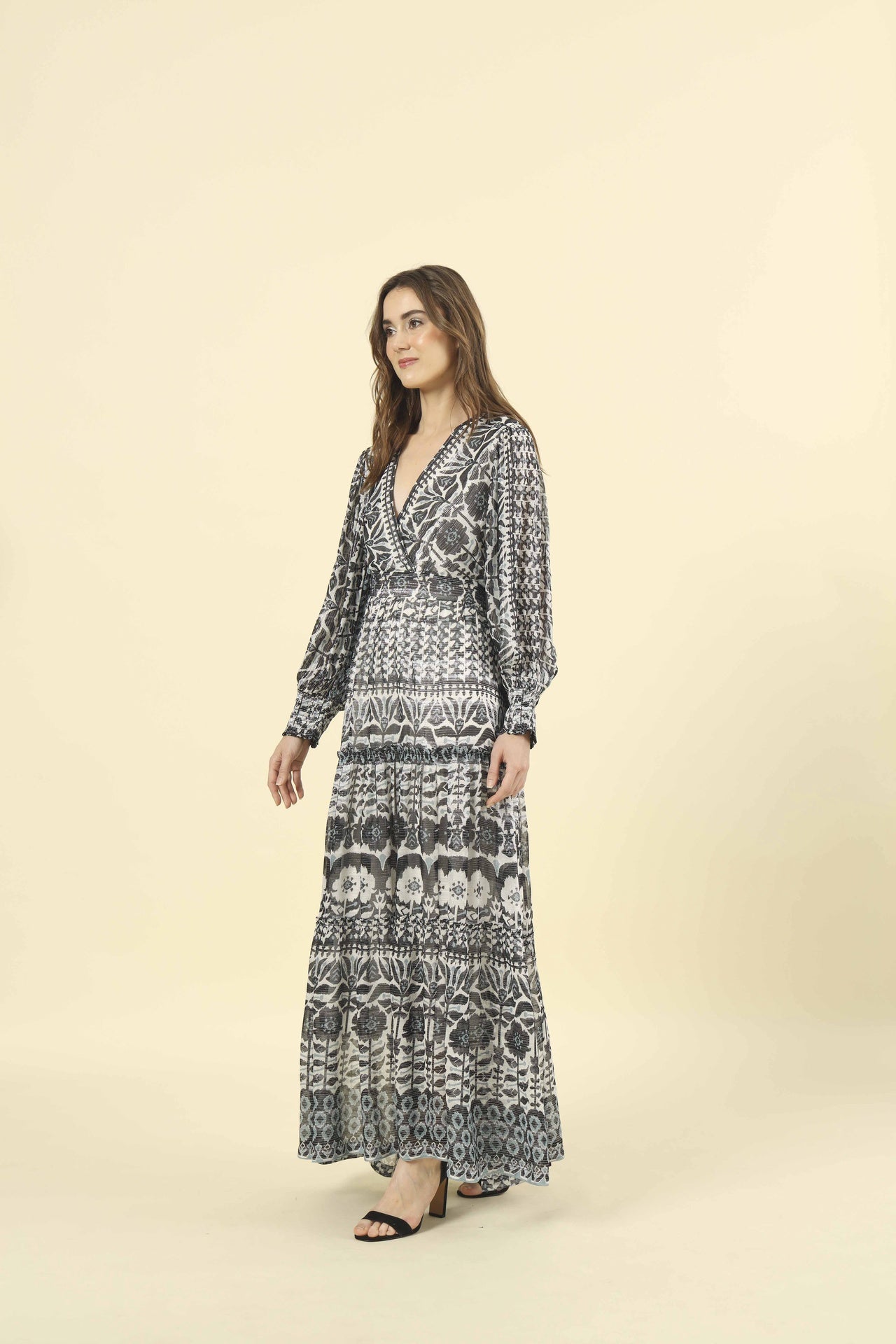 An elegant look that's oh-so-perfect for evenings out, this breezy full-length Sloan Maxi caftan-style dress adds a key piece to your wardrobe. Sleeves with a smocked cuff can easily be adjusted -- push them up or pull them down. Fun bubble sleeves, a v-neck, and a tiered flowy skirt pair perfectly with heels and a clutch to make a statement no one will soon forget.