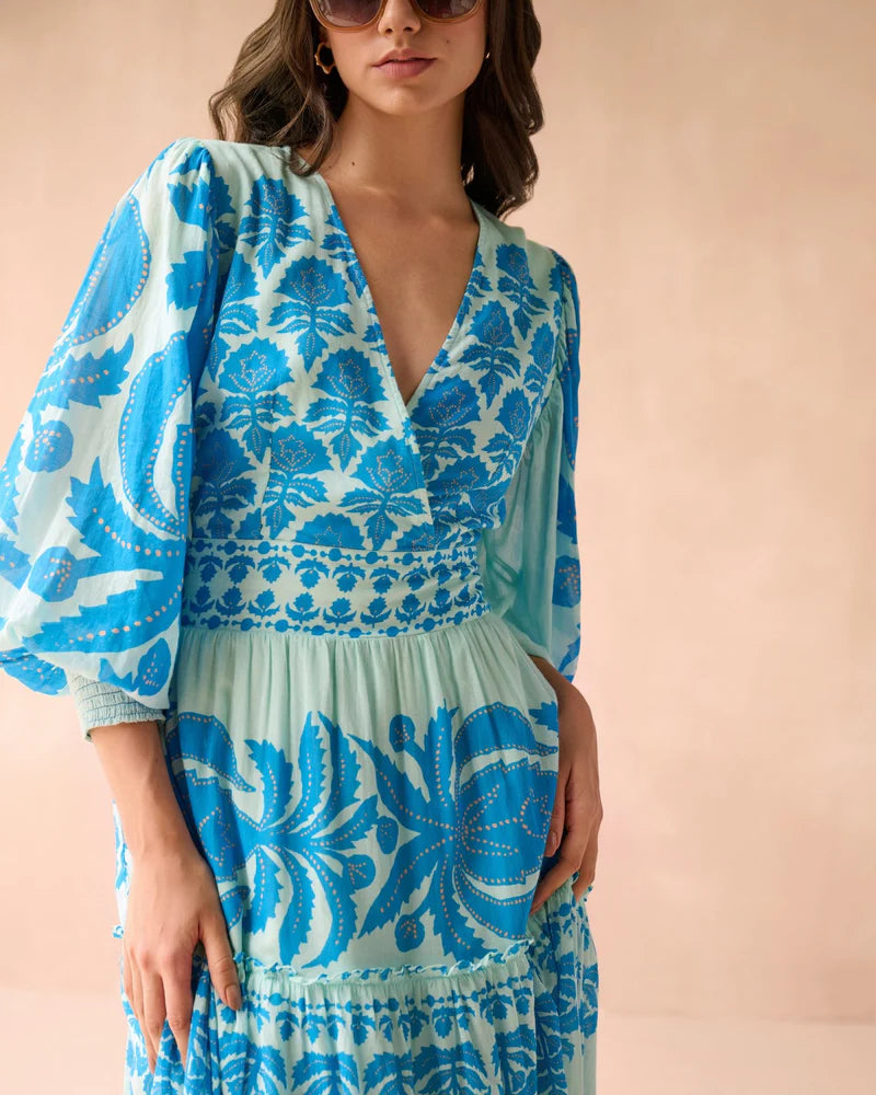 An elegant look that's oh-so-perfect for evenings out, this breezy full-length Sloan Maxi caftan-style dress adds a key piece to your wardrobe. Sleeves with a smocked cuff can easily be adjusted -- push them up or pull them down. Fun bubble sleeves, a v-neck, and a tiered flowy skirt pair perfectly with heels and a clutch to make a statement no one will soon forget.