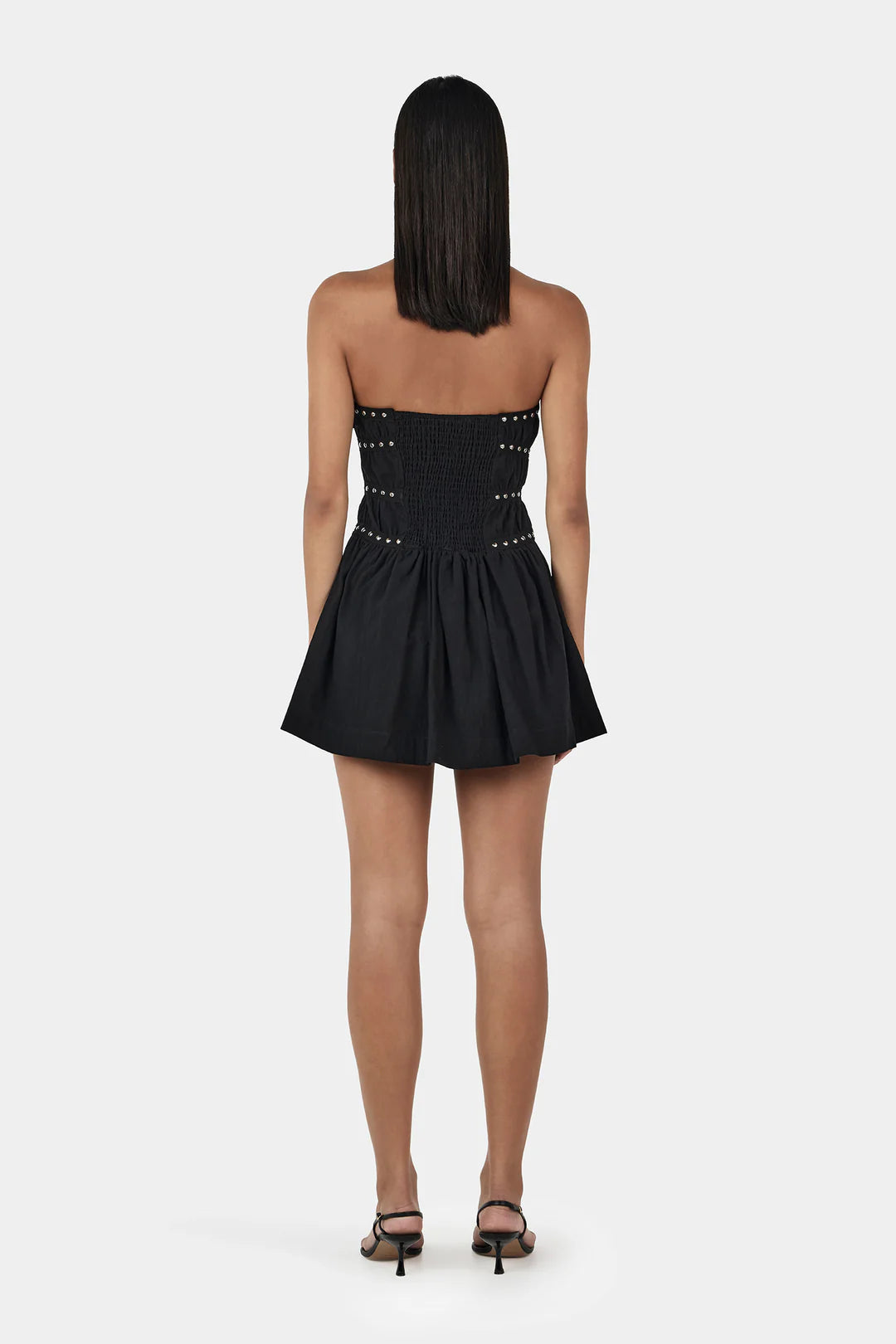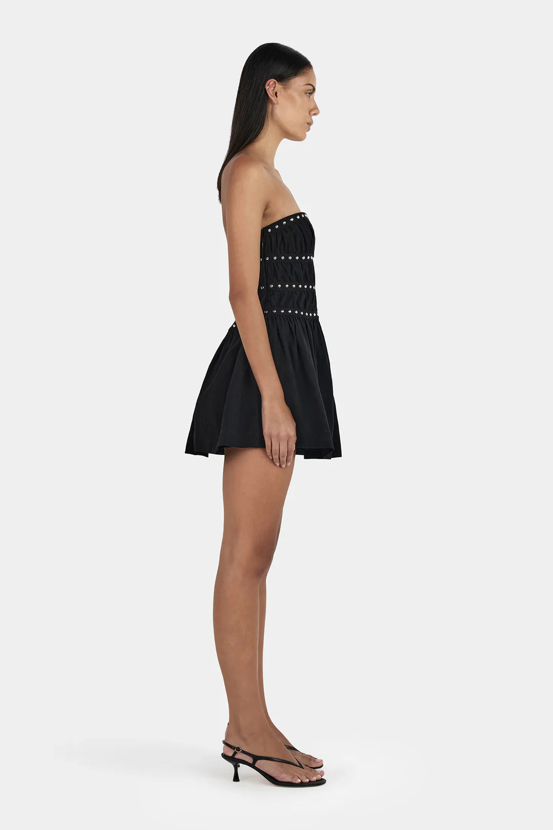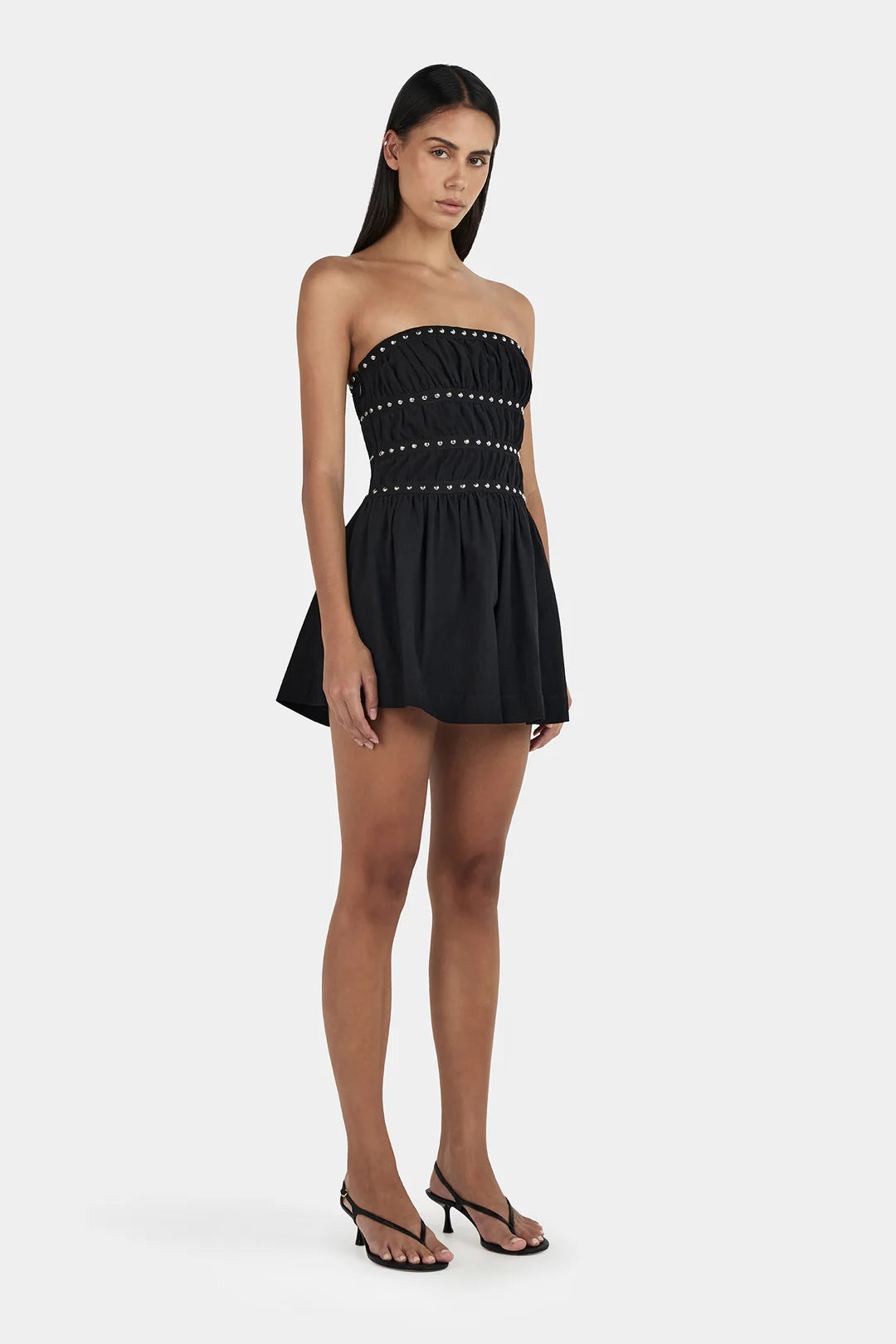 The Jenny Studded Mini Dress is a strapless mini with silver studded embelishments across the bodice. The dress has a shirred back and an invisible zipper for a seamless finish.