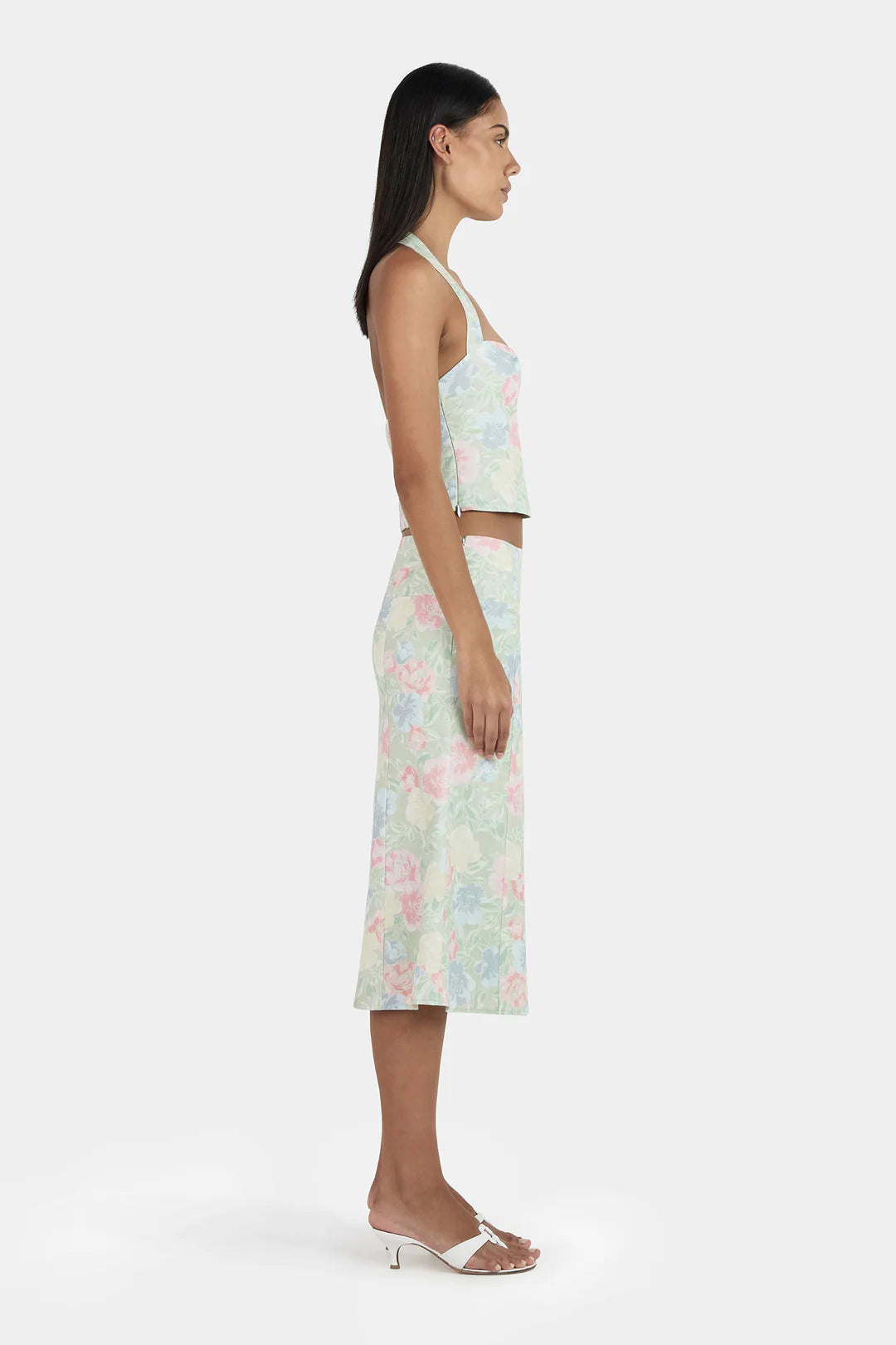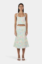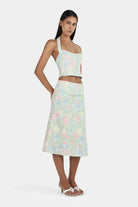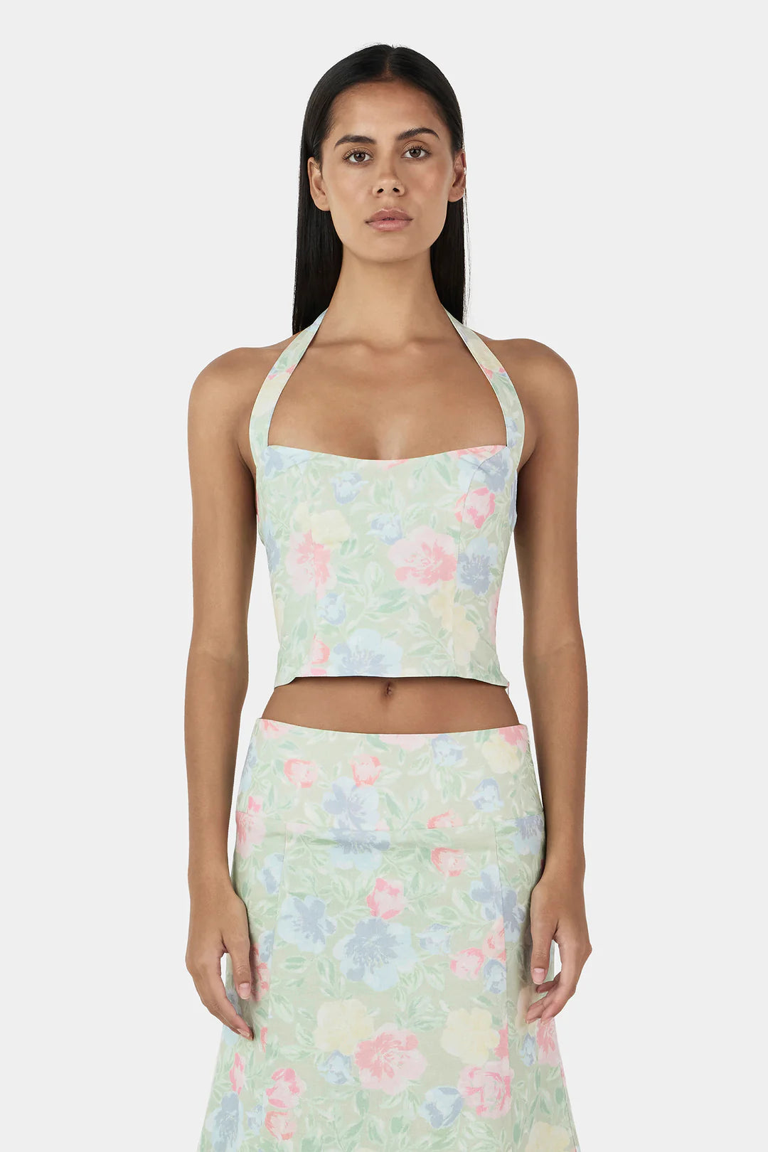 The Lee Lee Linen Top is a bodice corset top with princess seams for a flattering shape. There is a shirring panel at the back and wide straps that go into a halter neck.