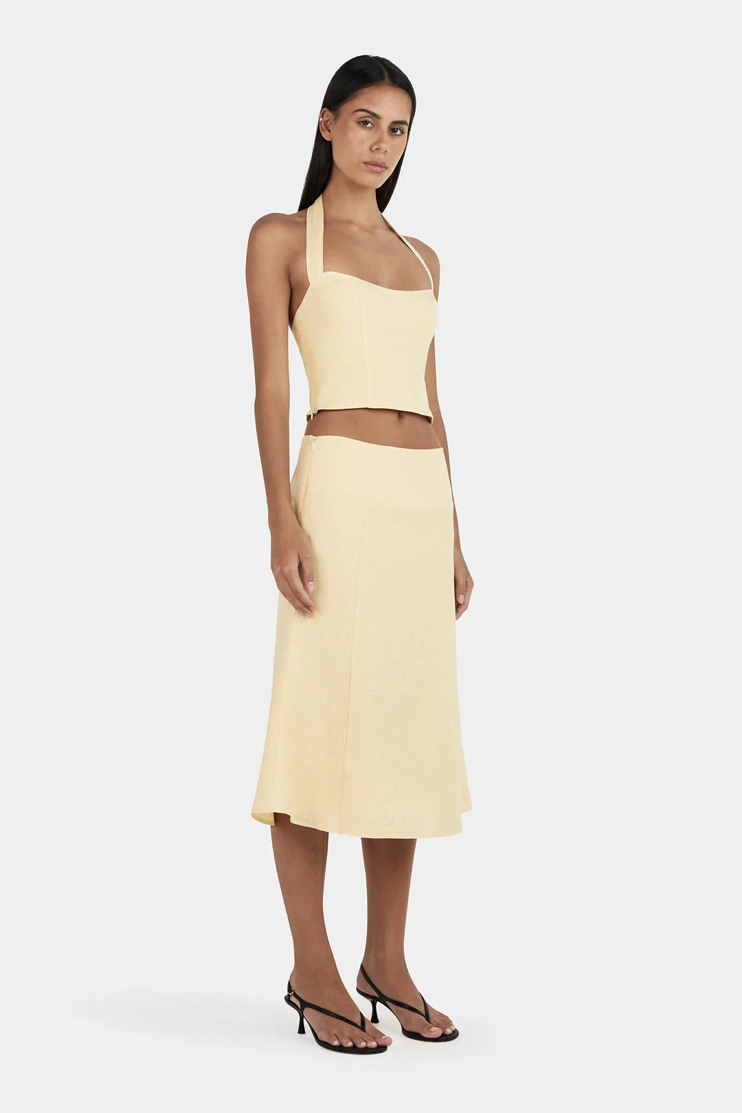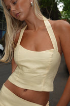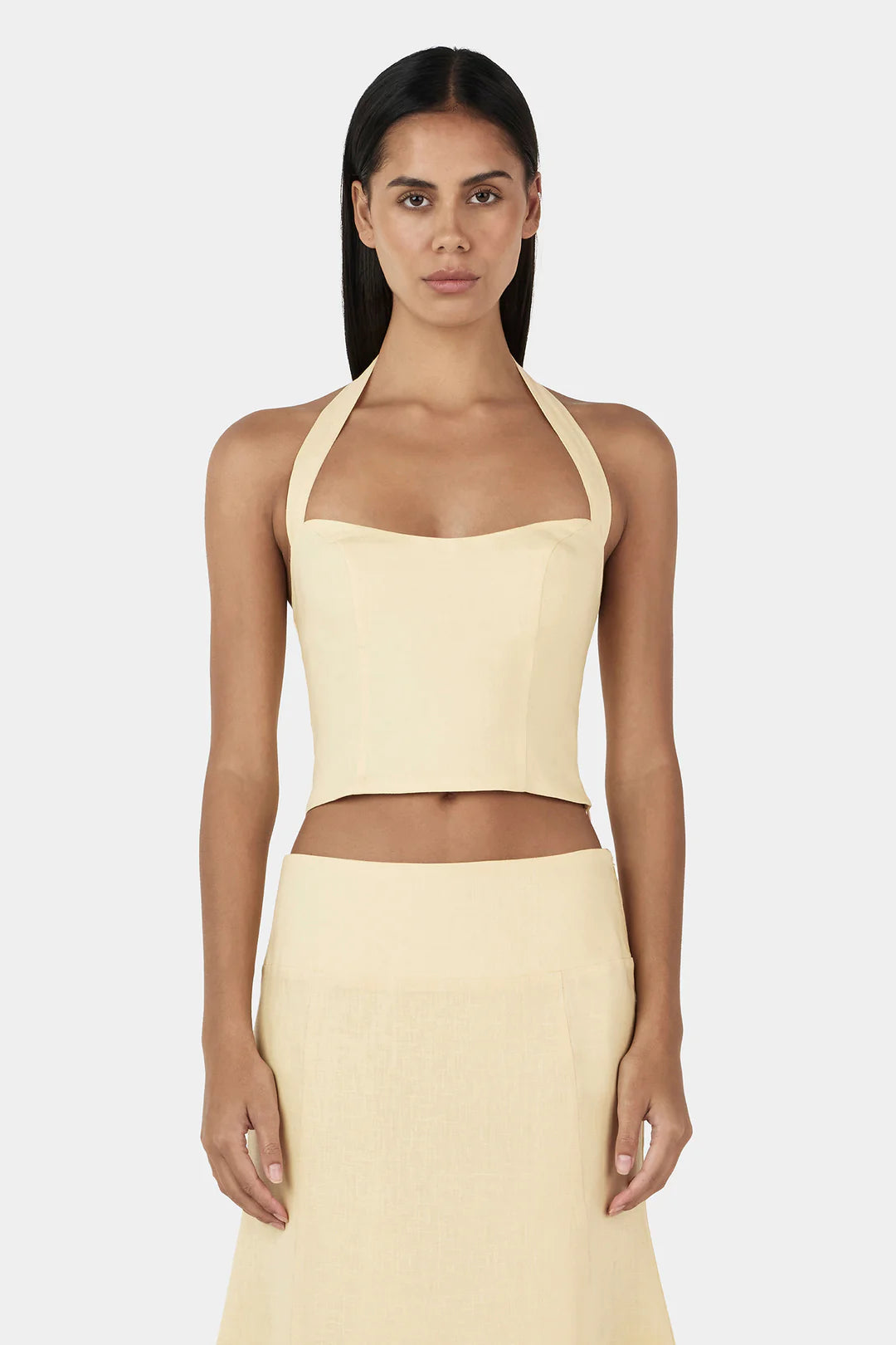 The Lee Lee Linen Top is a bodice corset top with princess seams for a flattering shape. There is a shirring panel at the back and wide straps that go into a halter neck.