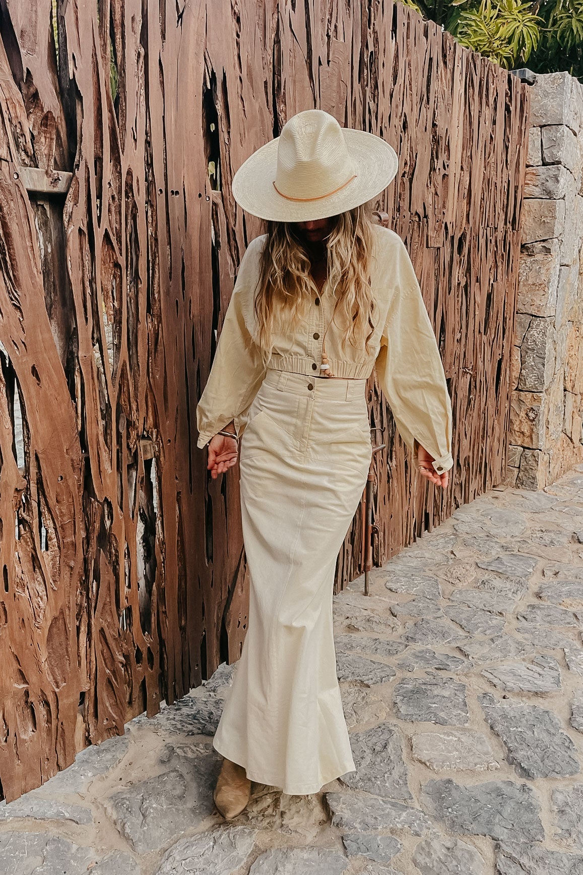A JPB fav, the maxi skirt, now in a durable, cotton twill reminiscent of old Americana workwear. Fitted through the hips with an a-line silhouette, this high-rise maxi is a must!
