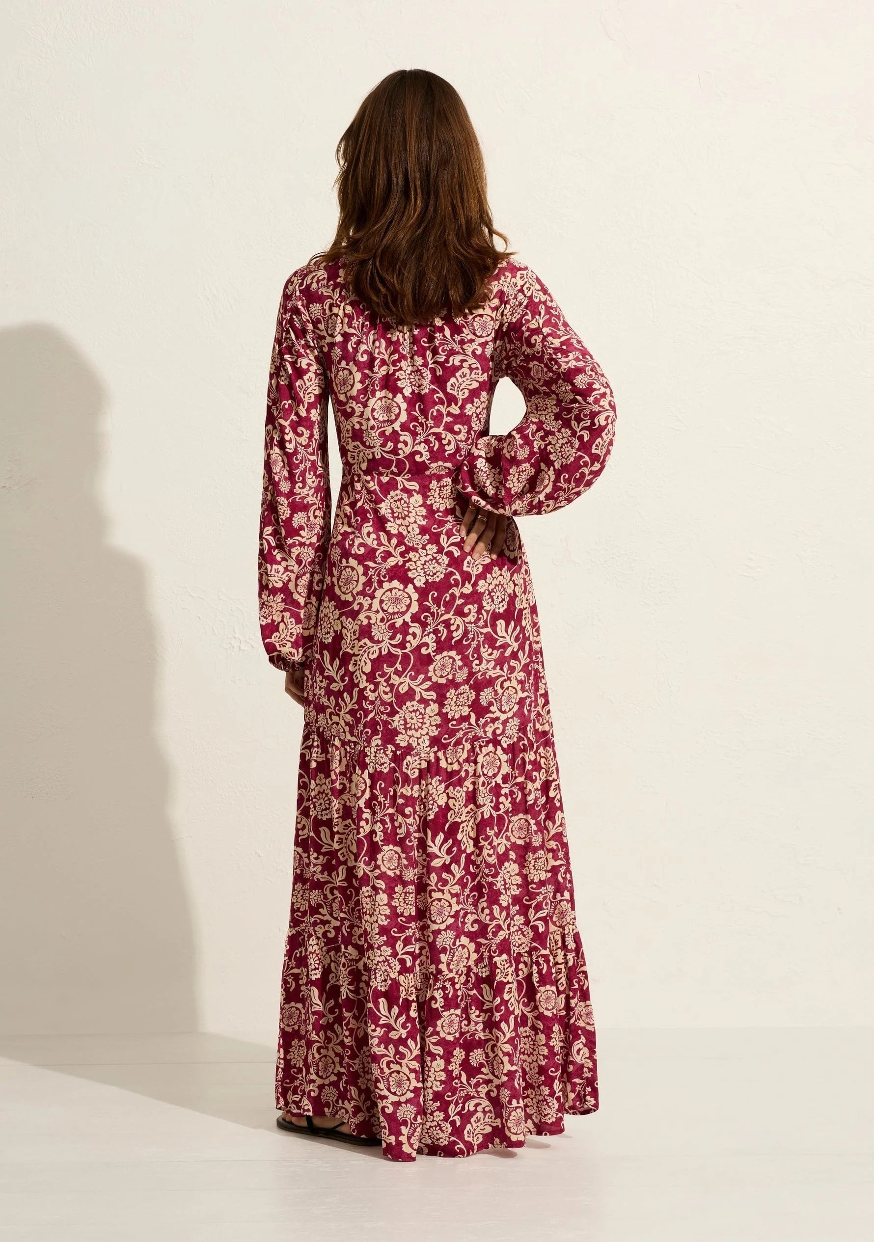 The Clovette Maxi Dress in Clover Print epitomises elegance with its V neckline and billowing blouson sleeves. It features an underbust seam with soft gathers and a tiered maxi skirt. This dress is a standout piece in any wardrobe.