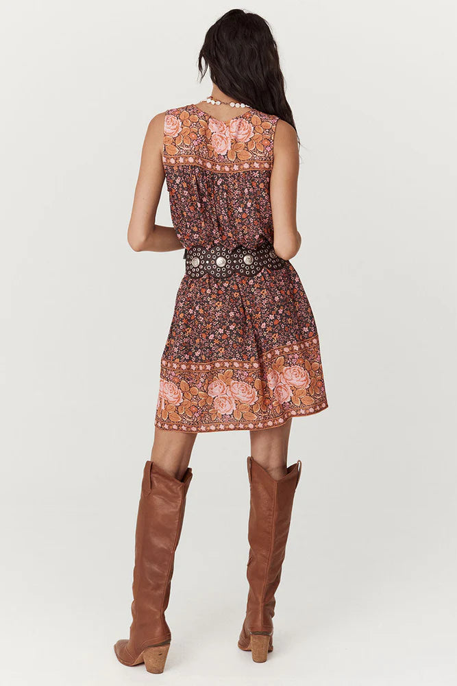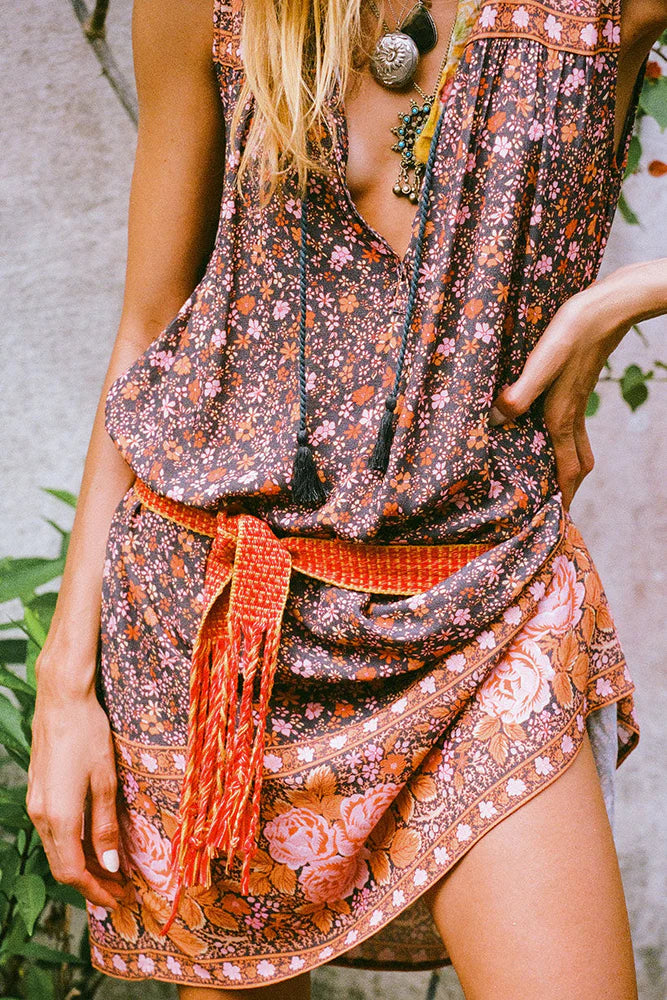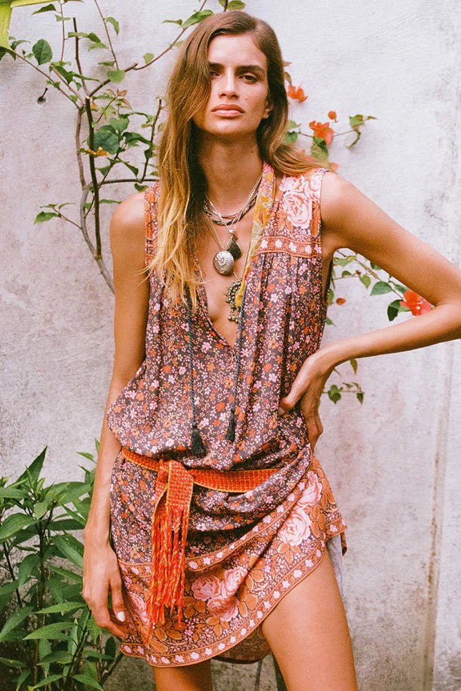 The Love Jetty Sleeveless Tunic Dress in Balmy Nights is a Spell favourite style reimagined in dreamy deep hues spliced together with striking border details and rambling floral print. An easy throw on piece, our tunic is light and breezy featuring neck ties with tassels for some 70’s bohemian charm. Style with boots and a white blouse layered underneath or over your favourite denim with beads and bangles, the possibilities are endless!