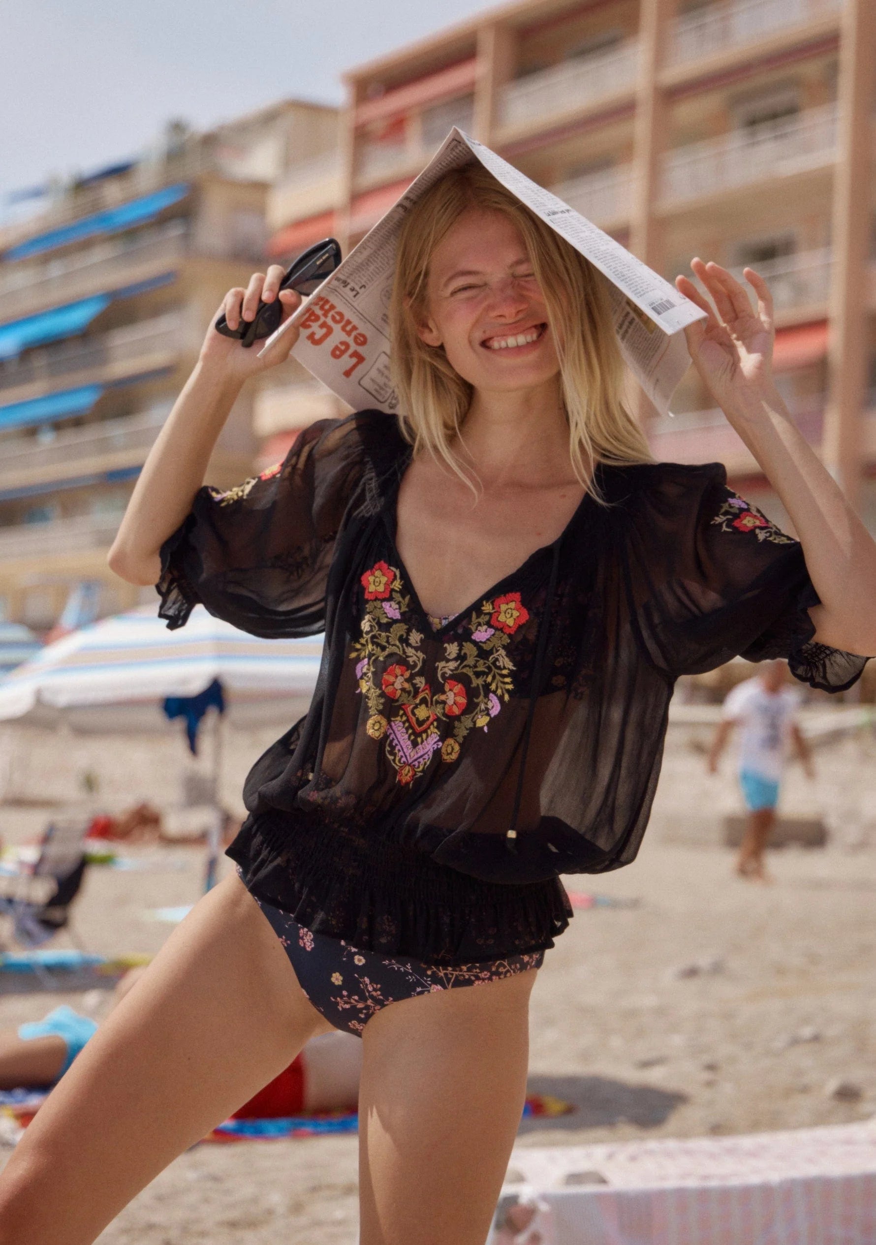The Coralie Blouse channels 60s bohemian elegance with its V neckline, featuring intricate hand shirring and embroidery on the neckline and sleeves, along with an optional tie closure. Crafted from a semi-sheer georgette crepe, no detail is spared. Pair it with your favorite vintage denim any day of the week!