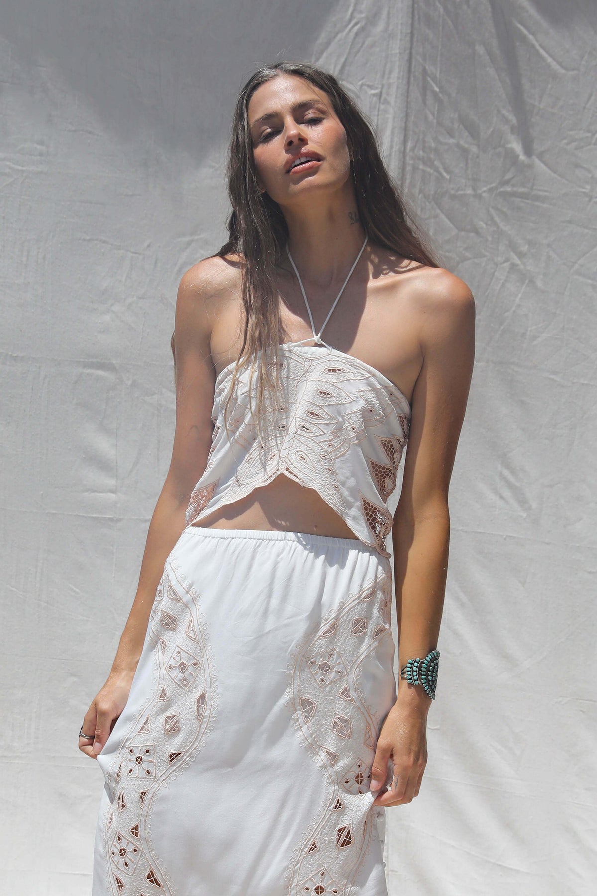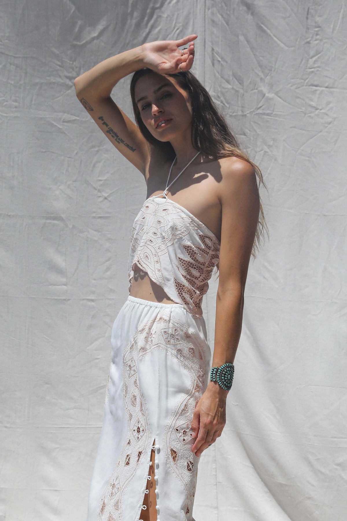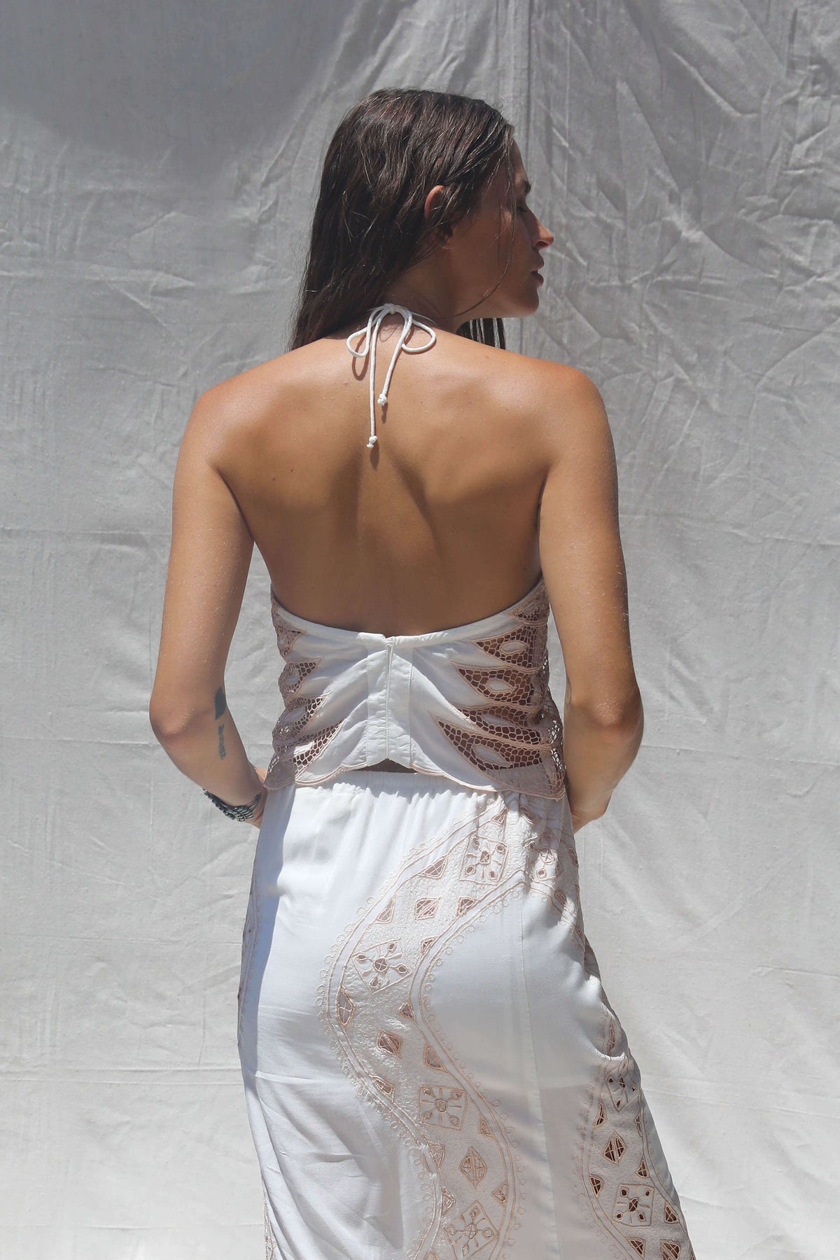 A crop named after a queen! Our Dolly Crop Top is the cotton version of our sequin, Monarch Crop Top. Featuring butterfly embroidery at the front, side cut-outs, and an adjustable halter tie that can be worn around the neck or secured and hidden, this crop is perfect for beach days, festivals, and anytime you want to show a little skin.