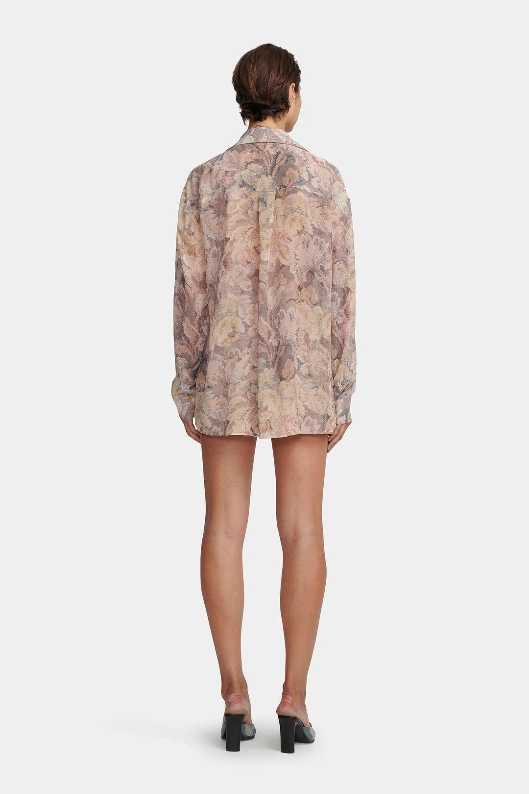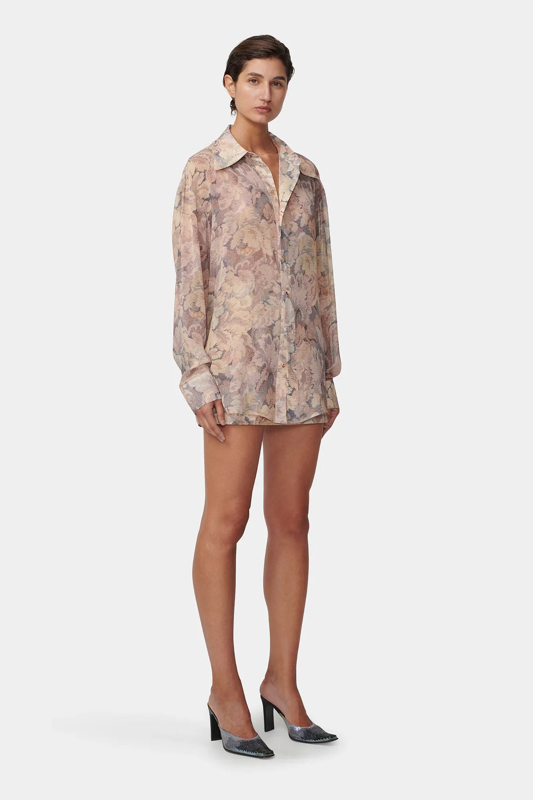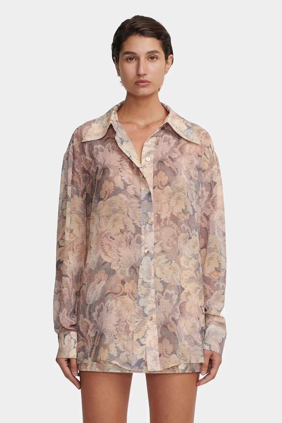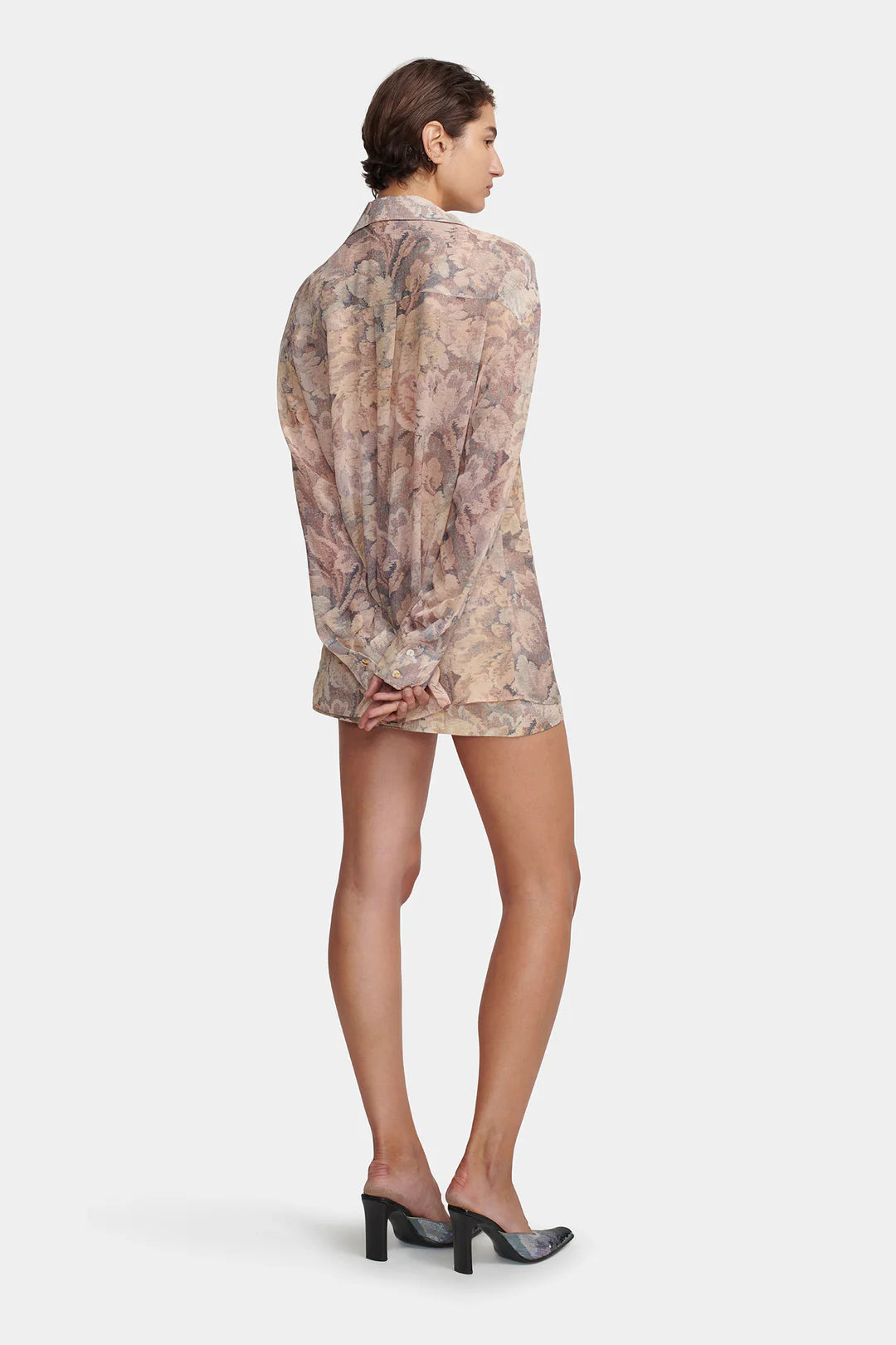 The Jude shirt is a H&G staple in a relaxed, slightly oversized cut. Featuring a classic collar and lapel, exaggerated cuffs and mother of pearl buttons, this season's Jude shirt comes in a recycled poly georgette fabrication. Pair with the Teller mini skirt for a youthful look, or the Uma suit pant for sophisticated tailoring.