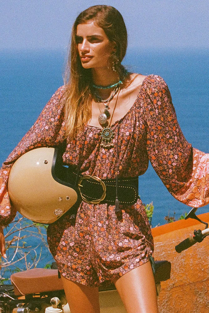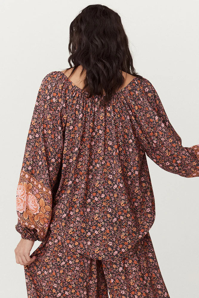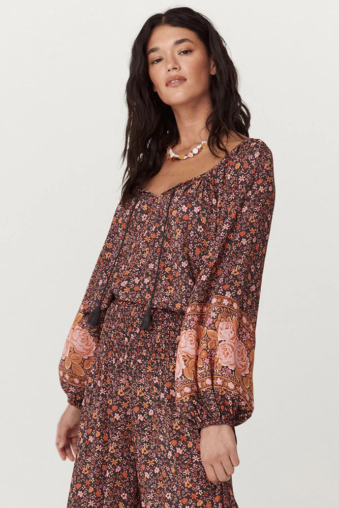 Slip into a memory of balmy nights and festoon lights with the Love Jetty Blouse in Balmy nights (of course!). With a relaxed silhouette and vintage-inspired floral print reminiscent of a meadow in bloom, it’s a timeless piece that feels both familiar and new. Our blouse includes elasticated cuffs for the girl on the go, a striking border print at the sleeve and neck ties with tassels for added charm. We imagine our blouse paired with the matching wide leg pants for a print on print ensemble or with your favourite denim for some everyday glam.