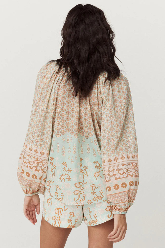 The Sweet Nothings Blouse in Peppermint evokes the beauty of an ocean breeze. Four tassel-trimmed ties with bells adorn the neckline, allowing you to wear it open or tied for a look that’s both sweet and sophisticated. The elastic cuffs and floating fit create an effortlessly romantic silhouette that moves with you, making this blouse perfect for the free-spirited girl on the go. Pair it with denim and sandals for a weekend look that always looks put together or tuck it into the Sweet Nothings Maxi Skirt for a look that's as timeless as it is captivating.