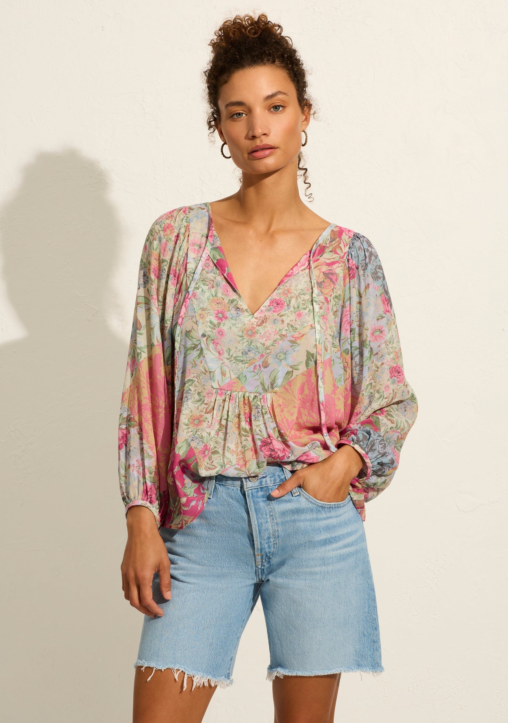 The Willow Blouse in our Fleur Floral epitomizes quintessential Auguste with its relaxed, floaty silhouette. It features an optional open-close neckline with tie detail, 3/4 elasticated sleeves. Crafted from a silky cotton blend with a soft hand feel, it's an Auguste bestseller.