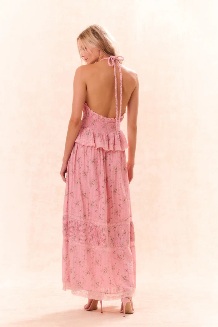 Introducing the Avice Dress. This chic evening maxi is easy and feminine designed with a floral-printed cotton fabric. The halter dress features braided self-tie straps that go up the neckline, a pretty, tucked empire waist panel, smocking at the back for a comfortable and easy fit, a peplum at the waist that releases into a Victorian-inspired skirt with tucking and laces stripped throughout. The dress comes fully lined and has pockets
