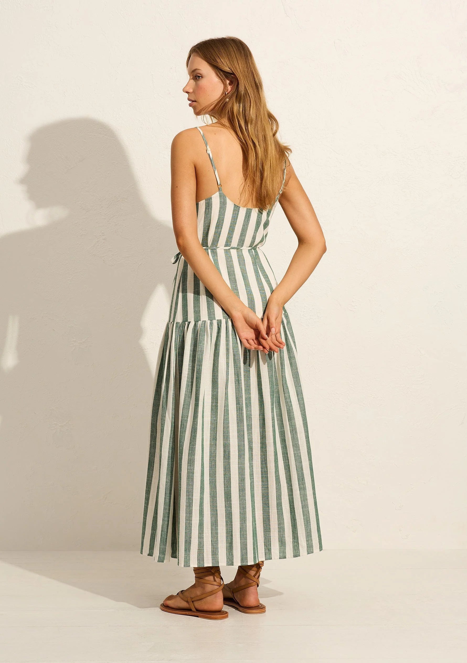 The Elowen Maxi Dress in our thick apple green and white stripe is a standout piece, crafted from linen. It features a V neckline, softly gathered bust, and a flattering drop waist that flows into a voluminous skirt, complete with an optional tie for a more fitted look