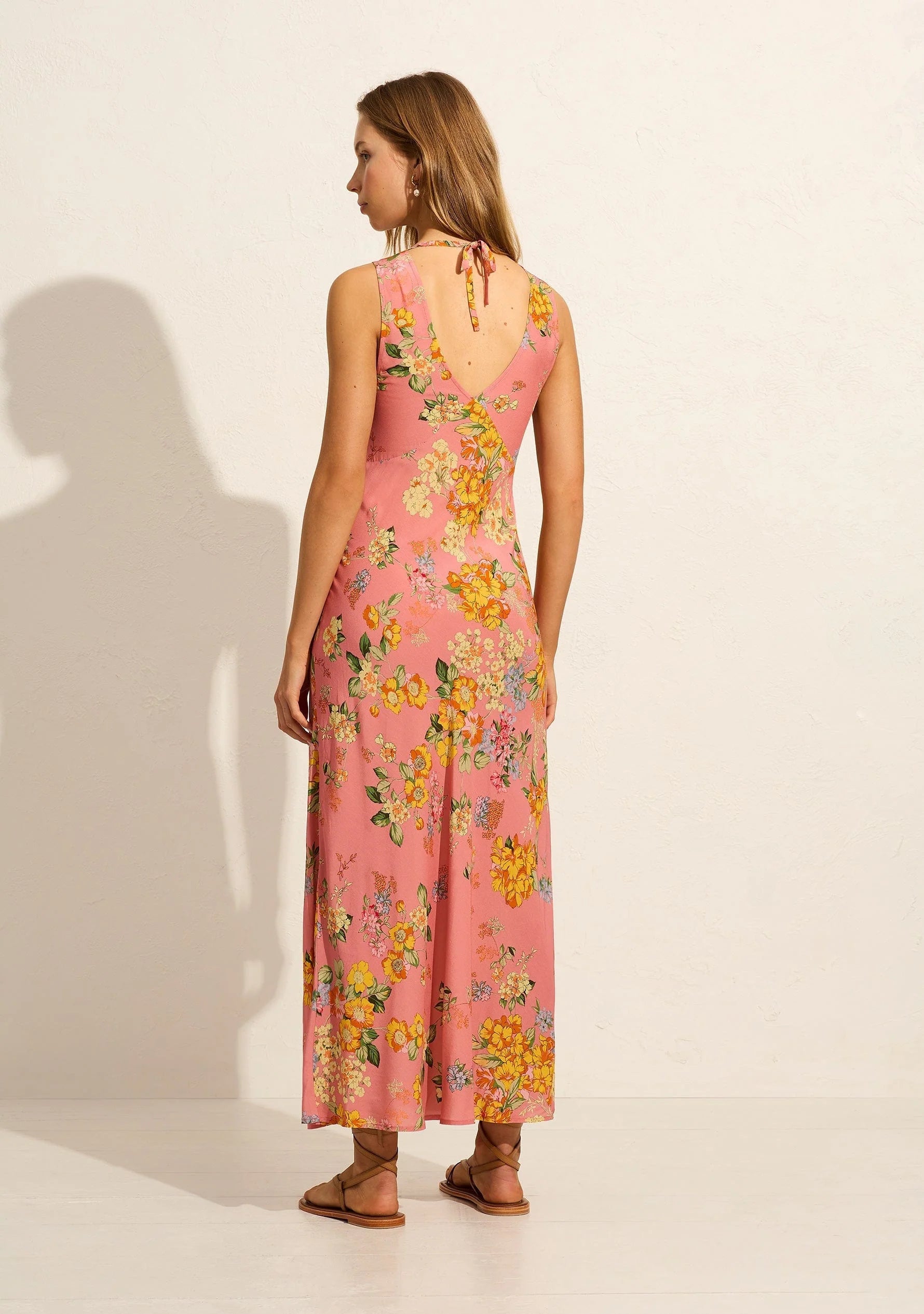 The vintage-inspired Lara Slip Maxi Dress in the pink Azalea floral print features a classic V-neckline, a delicately gathered bust, and a flattering bias-cut silhouette that flows to an elegantly draped hem