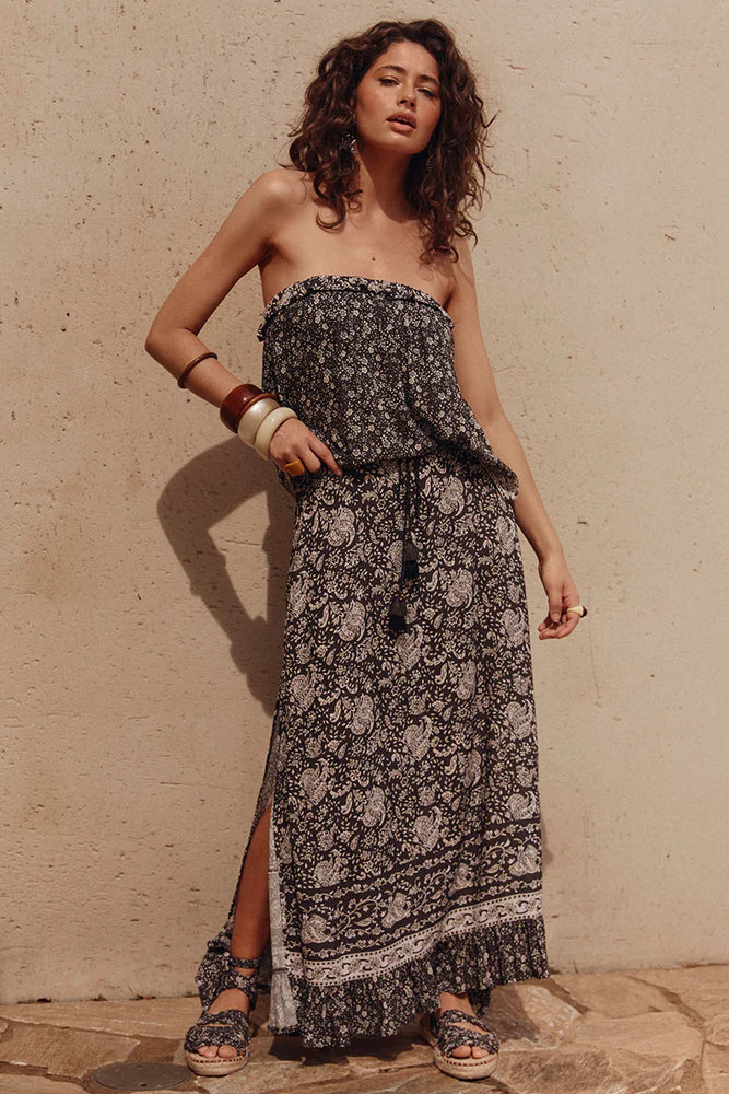 The Little Bird Slimline Skirt in Midnight is a chic blend of timeless elegance and bohemian charm. Made from 100% LENZING™ ECOVERO™ Viscose, this skirt features a striking allover print, beautifully complemented by a border print at the hem.